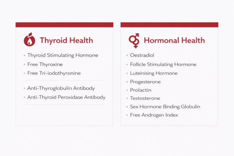 This test provides an overview of your hormone and thyroid health. It measures key markers involved in metabolism, energy, fertility, and overall wellbeing, including thyroid antibodies, thyroid hormones, and reproductive hormones. This test can help identify hormonal imbalances and thyroid disfunction that may contribute to symptoms such as fatigue, weight changes, or irregular cycles.